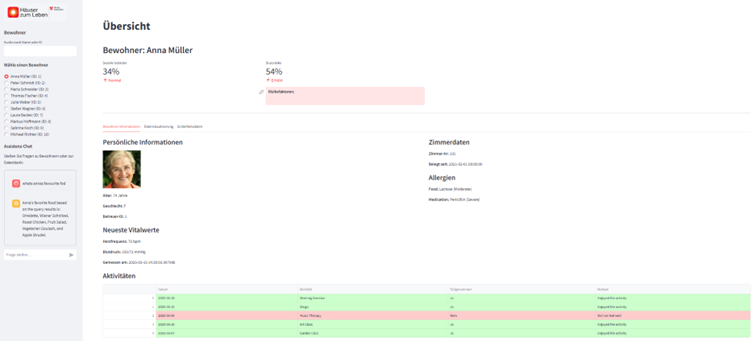 Die Lösung des Teams umfasste eine Datenbank inklusive Datenbankmanagementsystem um Informationen der Bewohner*innen und der Mitarbeiter*innen zu verwalten. Das Team nutze Streamlit – eine leistungsstarte Open Source Python Bibliothek zum Erstellen und Teilen benutzerdefinierter Web-Apps für maschinelles Lernen und Data Science. In der Applikation werden persönliche Informationen, Aktivitäten, Vitalwerte und relevante Schlüsselkennzahlen (engl.: Key Performance Indicators, KPIs), wie soziale Isolation und Sturzrisiko, je Bewohner*in aus dem Inhalt der Datenbank ermittelt und angegeben. Mit einem ChatBot auf Basis von Chat GPT-3.5-turbo, können einfach relevante Informationen aus der Datenbank bezogen werden. In weiteren Tabs können zeitliche Verläufe von Vitalwerten aber auch finanziellen Transaktionen visualisiert werden. Das fertige Produkt kann momentan unter diesem Link (Stand: 24.03.2025) getestet werden.